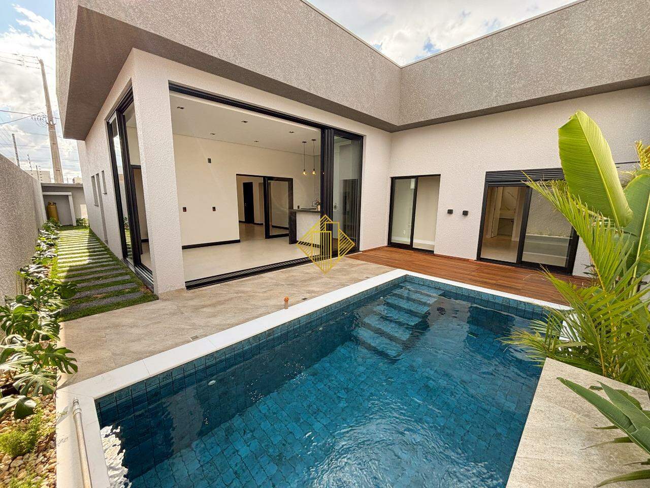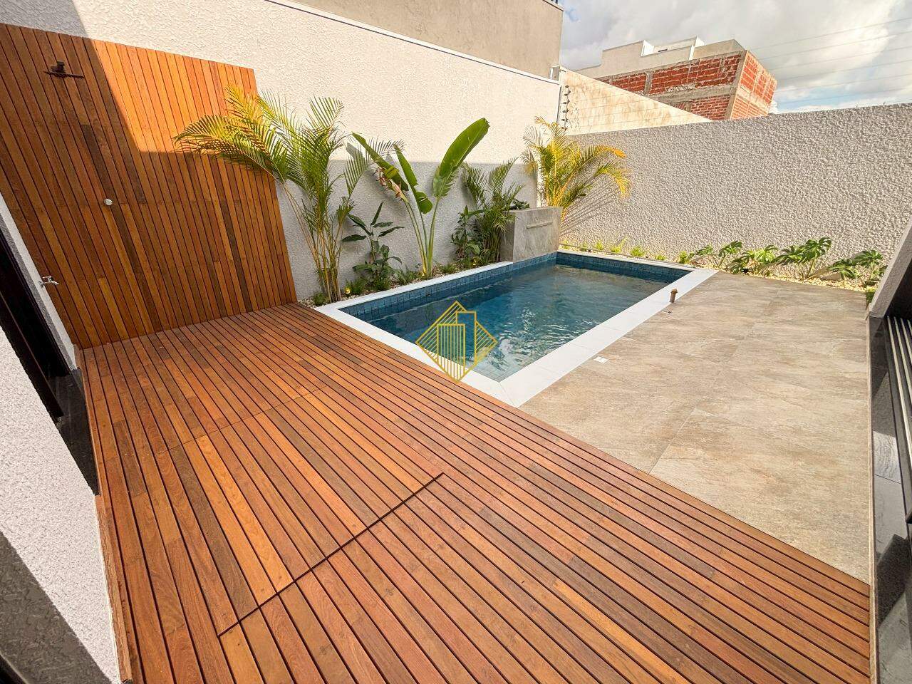 Piscina com Iluminação e Cascata e Deck de Madeira.